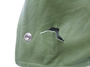 箱ポケットを引っ掛けられたことによる裂けです。部分的にポケットの縫いを解き、裏側から別革での貼り付け補修をします。羊革のため、補修箇所に若干の張り・厚味が発生します。