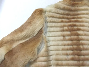 地皮の薄い毛皮製品は、脇や背中央部分に強い力が掛かるため、縫い目際に裂け傷みが発生します。裏側から細い糸で細かくカガリ留めしてから、粘着処理で補強しておきます。